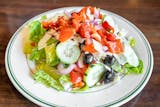 Topped with mushrooms, tomatoes, green peppers, onions, and olives.